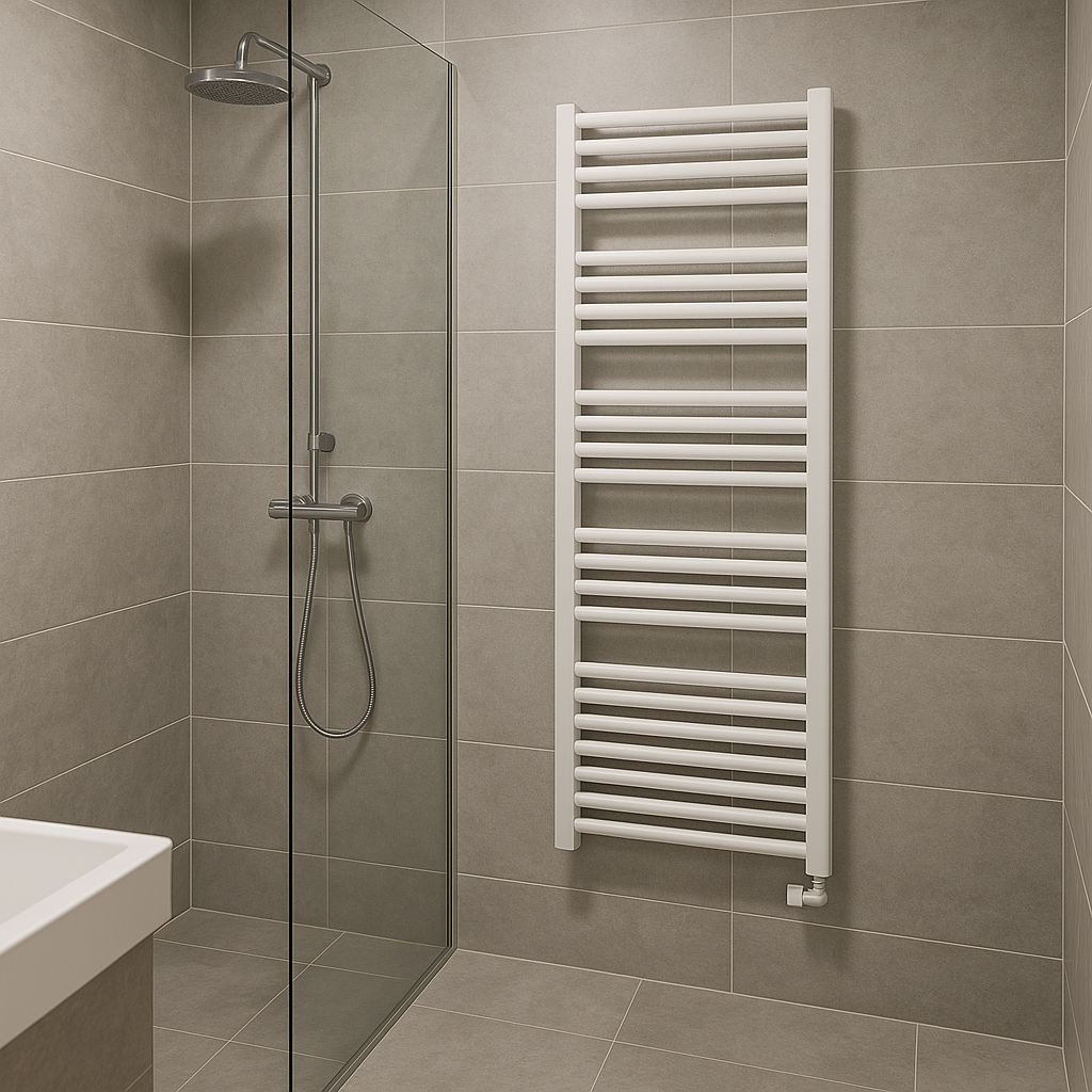 Net zo belangrijk als voldoende ruimte onder de radiator, is voorkomen dat je hem te hoog plaatst. Soms zie je in een badkamer een radiator boven een bad hangen, bijna tegen het plafond aan. Dat lijkt praktisch, maar technisch is het geen ideale plek. Warme lucht stijgt namelijk op. Wanneer een radiator te hoog hangt, blijft de warmte vooral bovenin de badkamer hangen. De temperatuur op vloerniveau blijft dan lager, terwijl je juist daar comfort wilt ervaren.